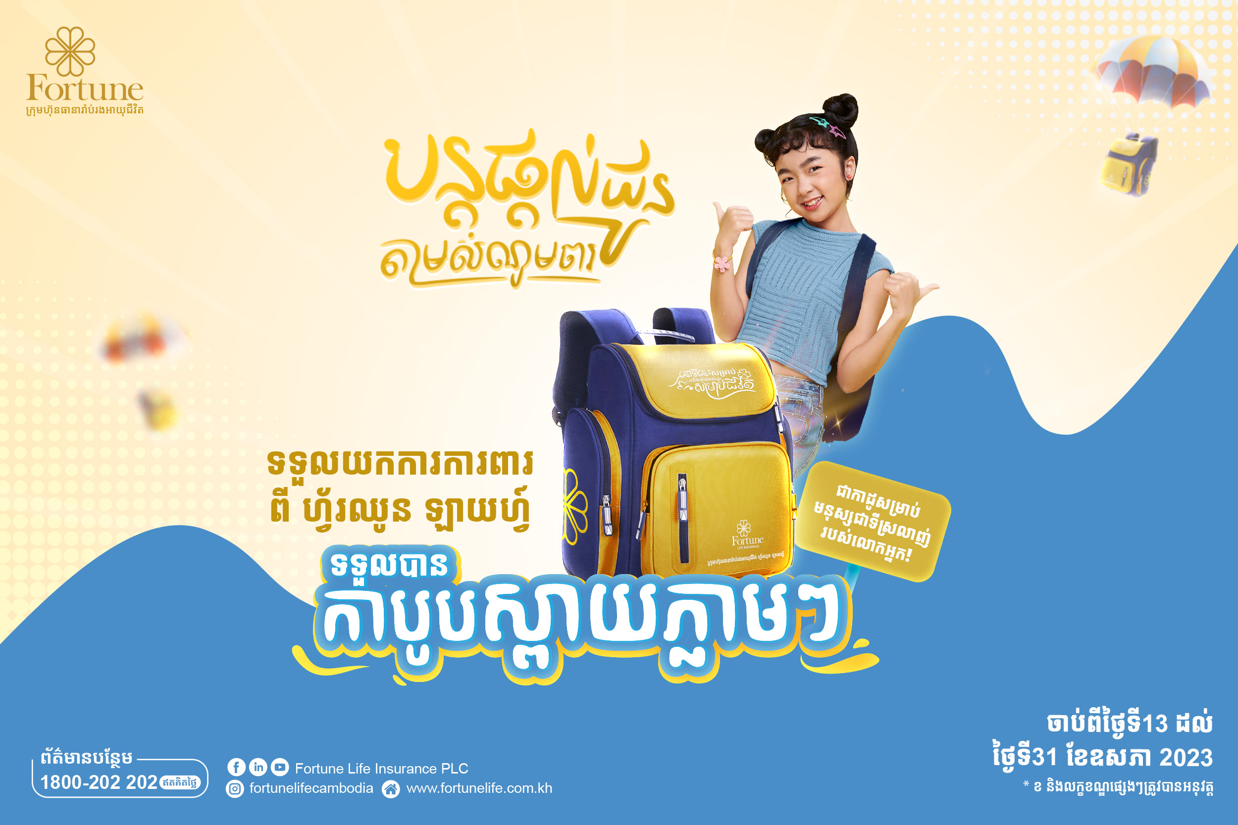 រួសរាន់ឡើង! ដើម្បីឆ្លើយតបតាមសំណូមពររបស់អតិថិជនជាច្រើន ក្រុមហ៊ុនធានារ៉ាប់រងអាយុជីវិត ហ្វ័រឈូន ឡាយហ្វ៍ នឹងបន្ដផ្ដល់ជូនកាបូបស្ពាយដ៏ស្រស់ស្អាតមួយភ្លាមៗសម្រាប់អតិថិជនដែលទិញផលិតផលប្រភេទណាមួយក៏បាន ចាប់ពីថ្ងៃទី13 រហូតដល់ ថ្ងៃទី31 ខែឧសភា ឆ្នាំ2023 នេះ។
