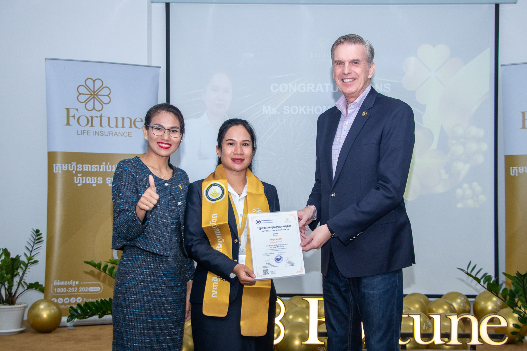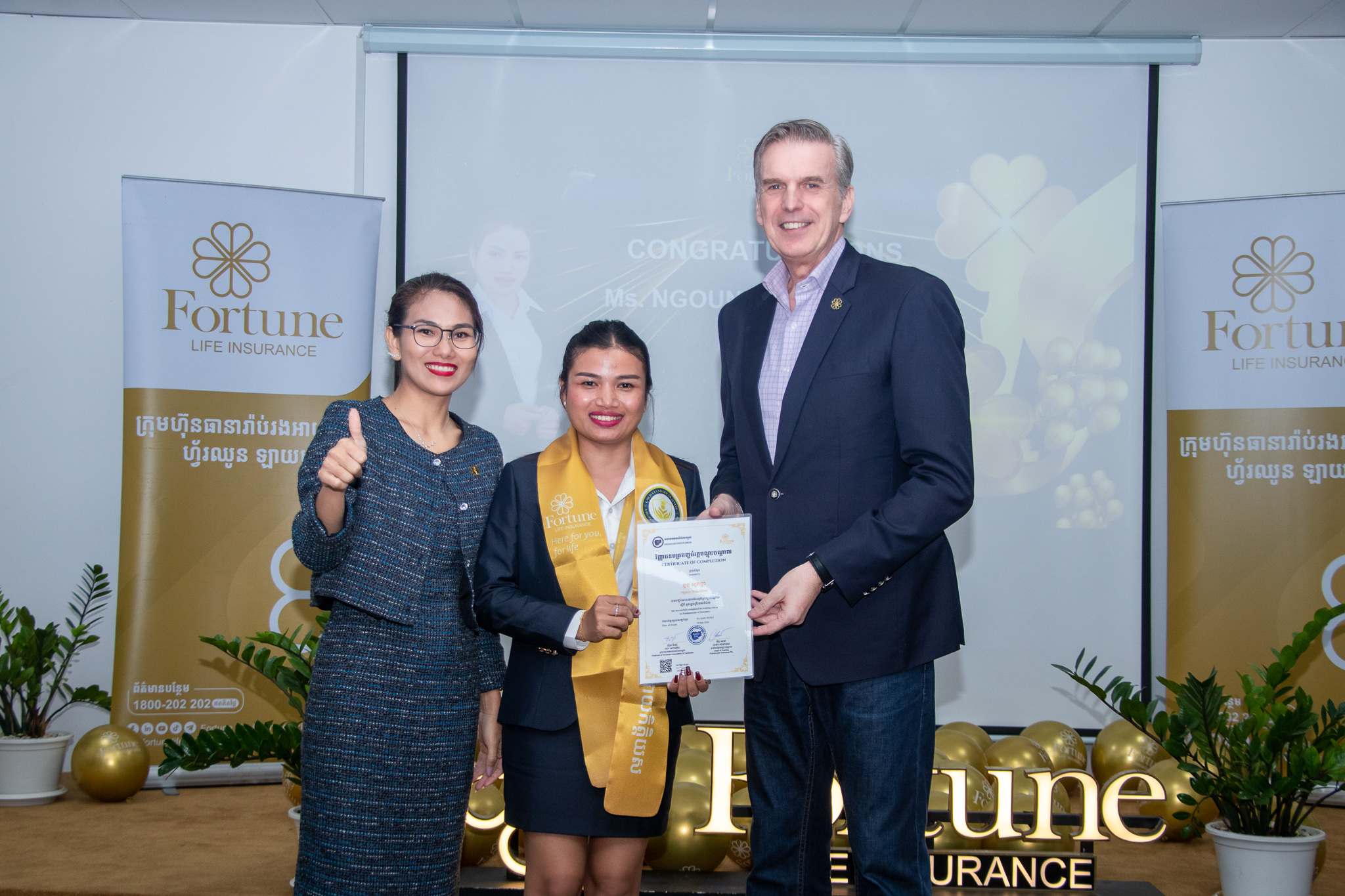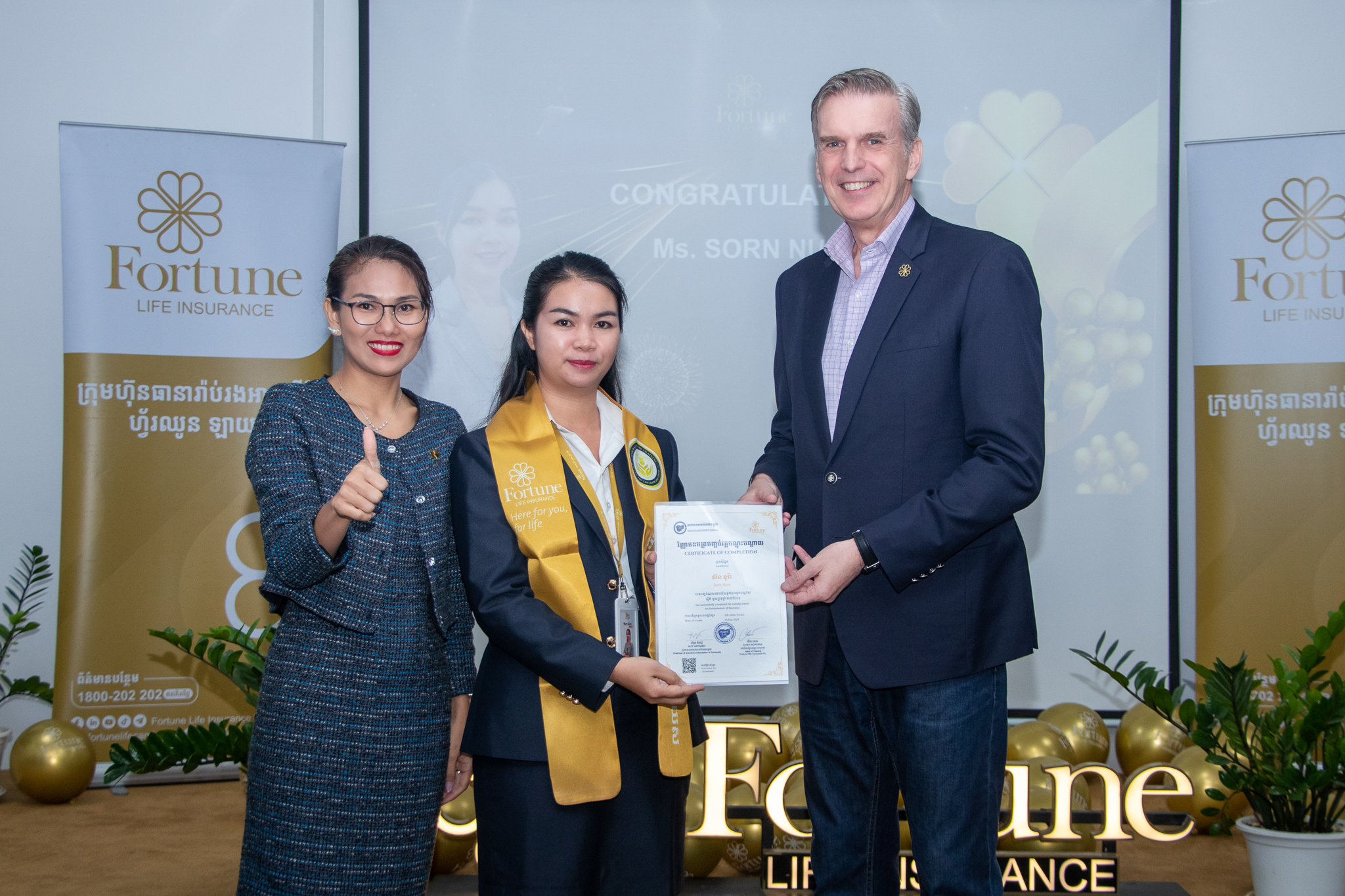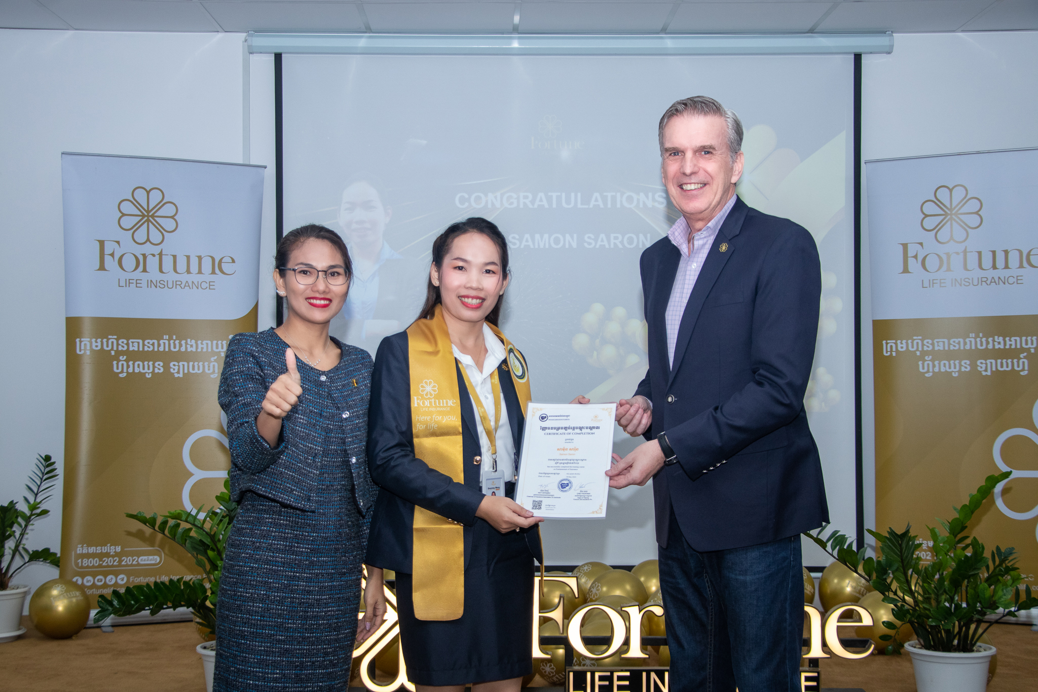 នារសៀលថ្ងៃសុក្រ ទី៥ ខែកក្កដា ឆ្នាំ២០២៤ ម្សិលមិញនេះ ក្រុមហ៊ុនធានារ៉ាប់រងអាយុជីវិត ហ្វ័រឈូន ឡាយហ្វ៍ បានរៀបចំកម្មវិធីអបអរសាទរជូនដល់បុគ្គលិកប្រឹក្សាធានារ៉ាប់រងអាយុជីវិតទាំង១០រូប ដែលបានបញ្ចប់ដោយជោគជ័យនូវវគ្គបណ្តុះបណ្តាលស្តីពីមូលដ្ឋានគ្រឹះធានារ៉ាប់រងពីសមាគមធានារ៉ាប់រងកម្ពុជា ក្រោមវត្តមានលោកអគ្គនាយក Jan Arend Wes និងមានការចូលរួមពីថ្នាក់ដឹកនាំប្រចាំនាយកដ្ឋាននីមួយៗ រួមជាមួយបុគ្គលិកជាច្រើនរូបរបស់ក្រុមហ៊ុន ហ្វ័រឈូន ឡាយហ្វ៍ ដើម្បីជាសក្ខីភាពនៅក្នុងកម្មវិធីដ៏ពិសេសនេះ។
