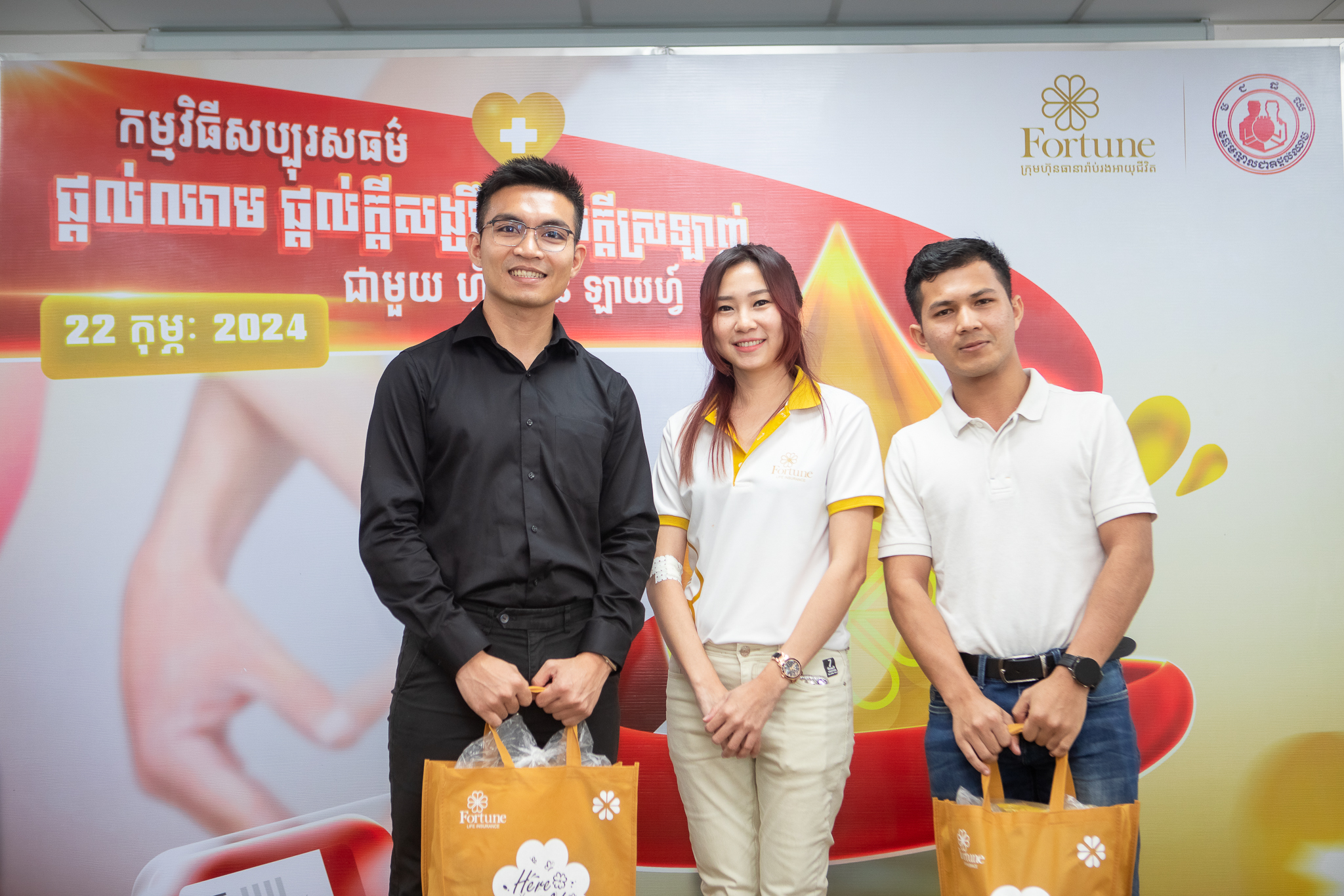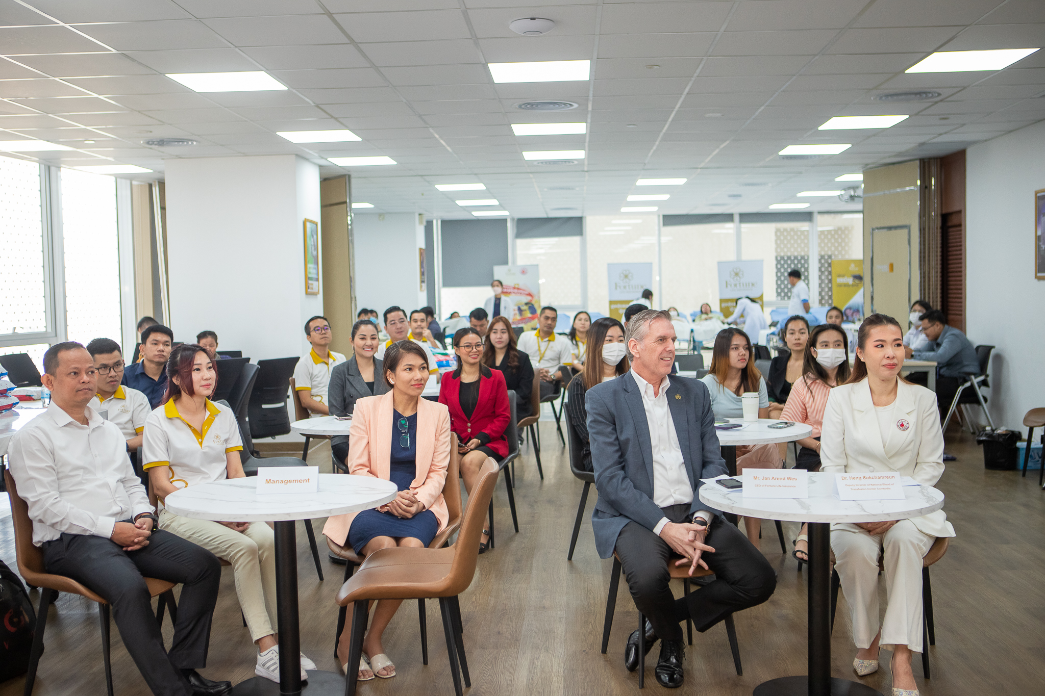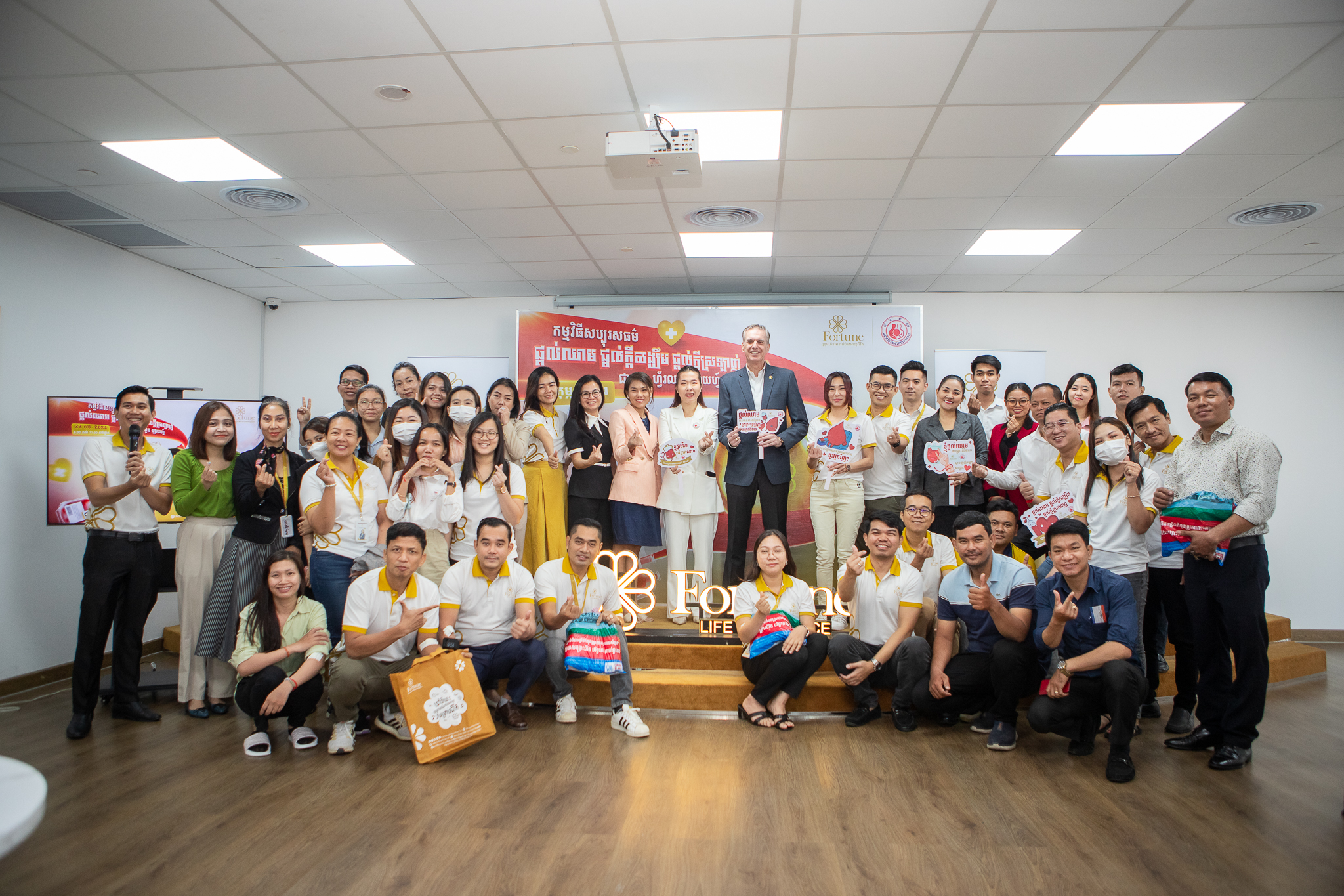 ក្រោមវត្តមានលោក Jan Arend Wes អគ្គនាយកប្រតិបត្តិរបស់ក្រុមហ៊ុនធានារ៉ាប់រងអាយុជីវិត ហ្វ័រឈូន ឡាយហ្វ៍, លោកស្រី វេជ្ជបណ្ឌិតឯកទេស ហេង សុខចំរើន អនុប្រធានមជ្ឈមណ្ឌលជាតិផ្តល់ឈាម, ថ្នាក់ដឹកនាំ បុគ្គលិក អតិថិជន សប្បុរសជន ជាពិសេសដៃគូអាជីវកម្ម និងសាធារណៈជនមកពីគ្រប់មជ្ឈដ្ឋានផងដែរ។
