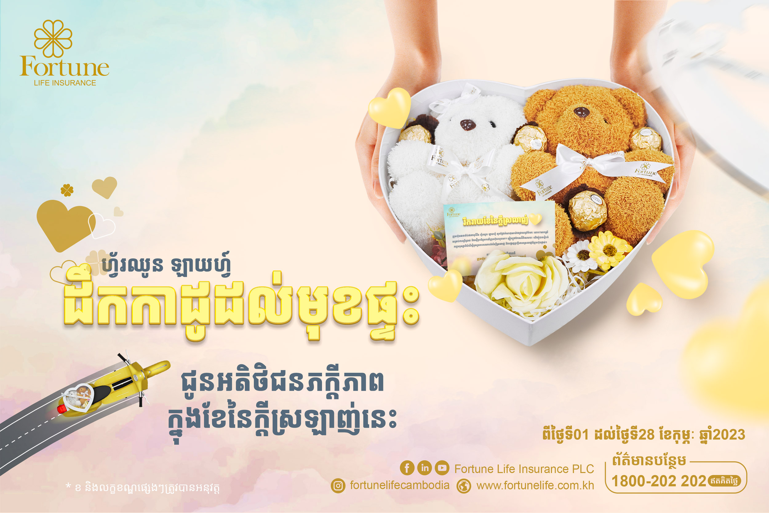 រីករាយខែនៃក្ដីស្រឡាញ់ និងដើម្បីថ្លែងអំណរគុណដល់អតិថិជនភក្ដីភាព ក្រុមហ៊ុនធានារ៉ាប់រងអាយុជីវិត ហ្វ័រឈូន ឡាយហ្វ៍ នឹងចែករំលែកក្ដីស្រឡាញ់ ដោយការផ្តល់ជូនកាដូអនុស្សាវរីយ៍មួយប្រអប់ដ៏ស្រស់ស្អាត ដល់អតិថិជនដែលបង់បុព្វលាភធានារ៉ាប់រងបន្ដចាប់ពី ២២០ ដុល្លារ ឡើងទៅ។