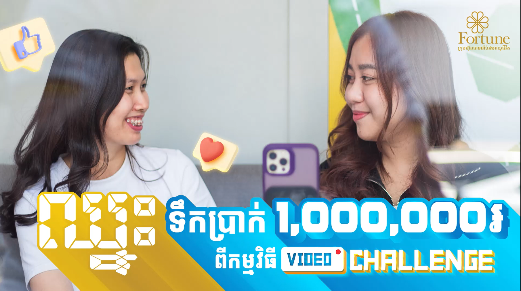 ក្រុមហ៊ុនធានារ៉ាប់រងអាយុជីវិត ហ្វ័រឈូន ឡាយហ្វ៍ មានកិត្តិយសបង្កើតកម្មវិធី Video Challenge ក្រោមប្រធានបទ “បទពិសោធន៍របស់អ្នកជាមួយ ហ្វ័រឈូន ឡាយហ្វ៍” ដែលកម្មវិធីនេះនឹងអនុញ្ញាតិជូនអតិថិជនរបស់ ហ្វ័រឈូន ឡាយហ្វ៍ និងបងប្អូនសាធារណជនទូទាំងប្រទេស ចូលរូមលេងដើម្បីមានឱកាសឈ្នះរង្វាន់លុយសុទ្ធរហូតដល់ ១លានរៀល ព្រមទាំងរង្វាន់លើកទឹកចិត្តជាច្រើនផ្សេងទៀត។
