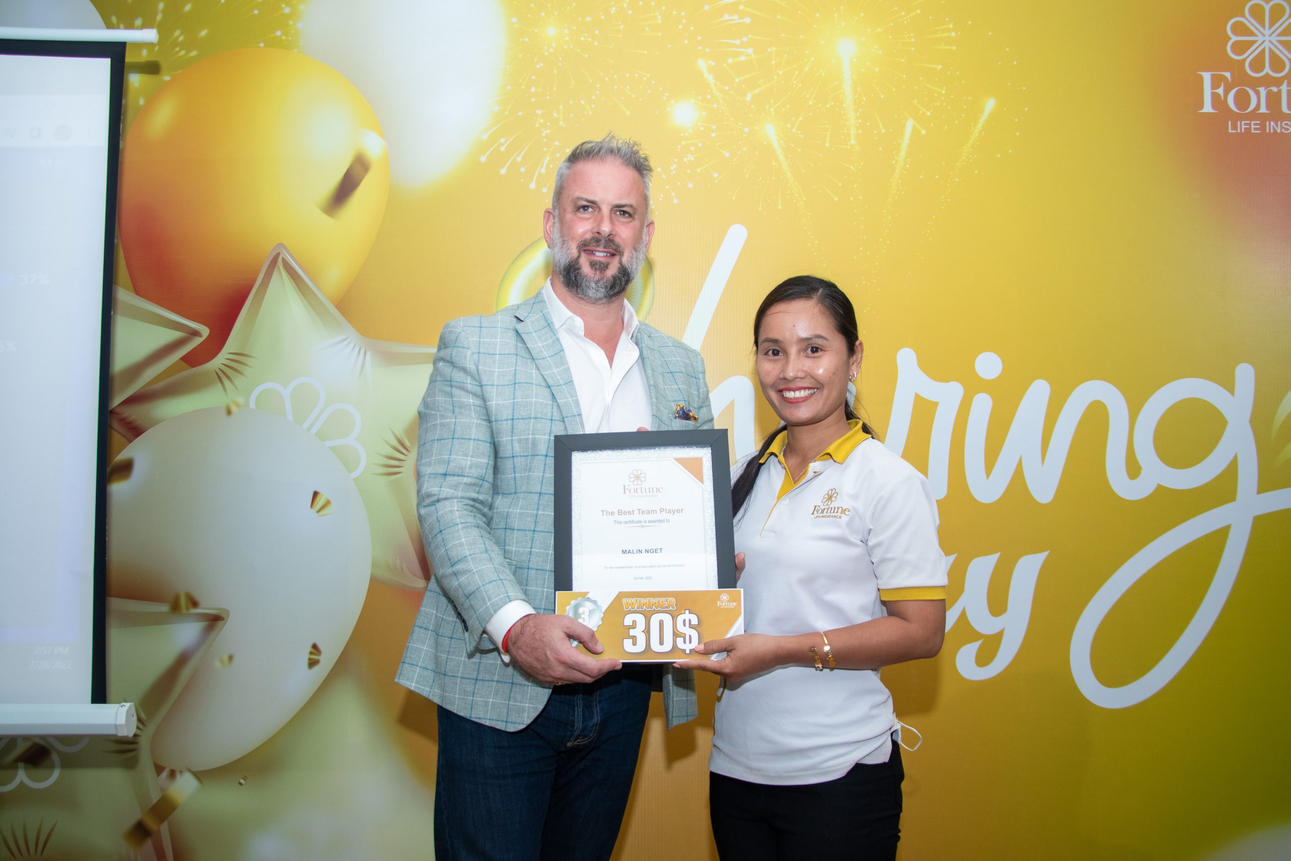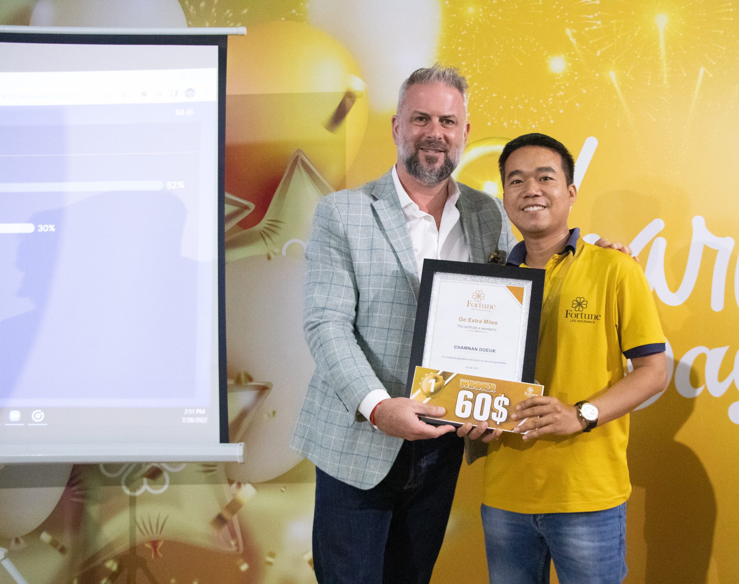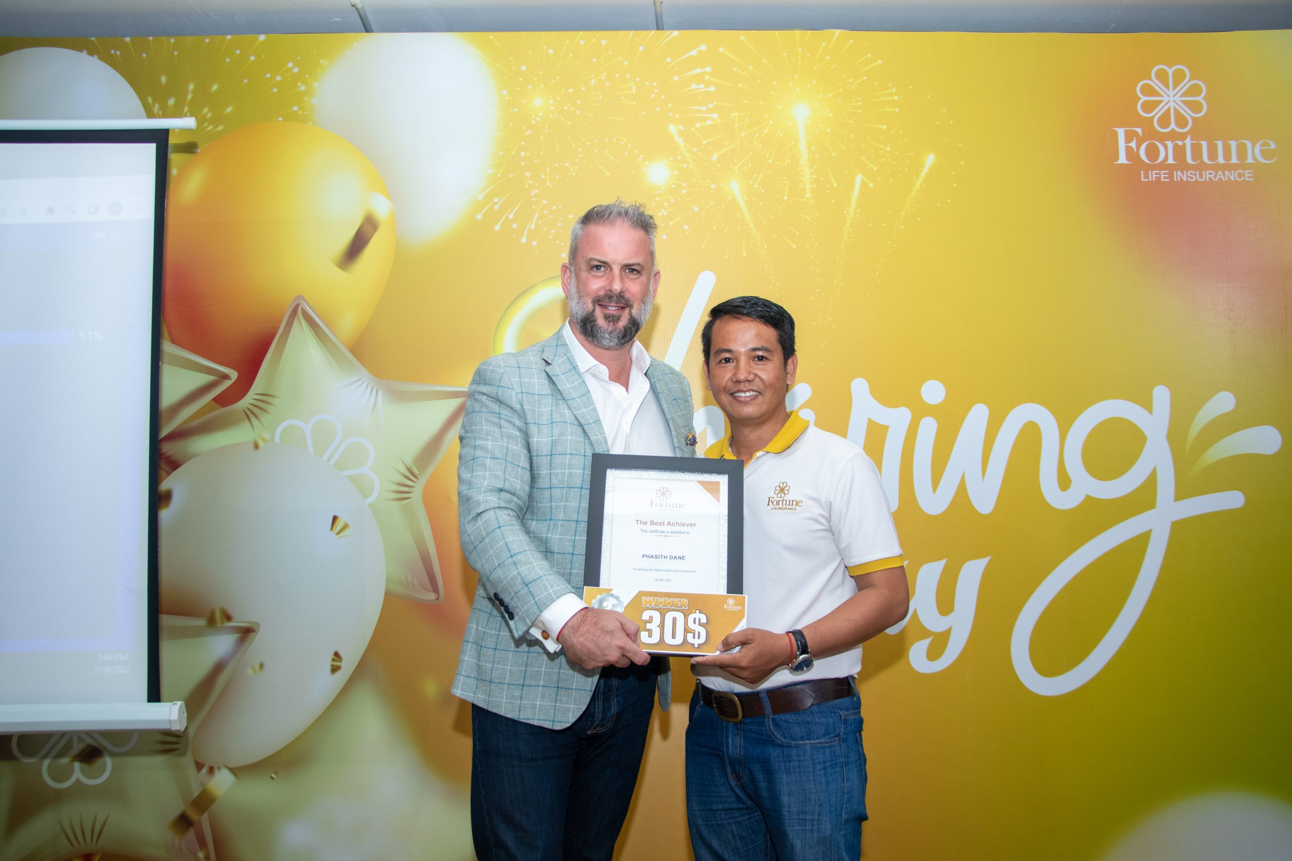 នាពាក់កណ្តាលឆ្នាំ ២០២២ នេះ ក្រុមហ៊ុនធានារ៉ាប់រងអាយុជីវិត ហ្វ័រឈូន ឡាយហ្វ៍ បានធ្វើការប្រគល់រង្វាន់ជ័យលាភីជូនដល់បុគ្គលិកឆ្នើម (Our Most Appreciated) ប្រចាំឆមាសទី១ និងជូនលិខិតសរសើរសម្រាប់បុគ្គលិកបំពេញការងារចាប់ពី ២ឆ្នាំ ឡើងទៅ អមជាមួយសកម្មភាពសហការជាក្រុម រួមនឹងកម្មវិធីកម្សាន្តសប្បាយរីករាយជាច្រើន។ បុគ្គលិកទាំងអស់ប្តេជ្ញាចិត្ត នឹងបន្តបេសកកម្មរៀងៗខ្លួនដើម្បីផ្តល់នូវសុខមាលភាពហិរញ្ញវត្ថុជូនបងប្អូនប្រជាជនកម្ពុជាទូទាំងប្រទេស។