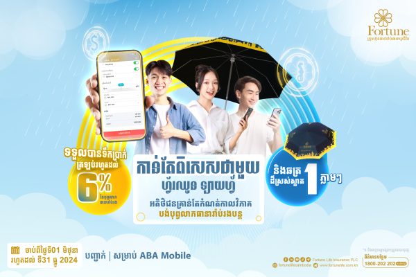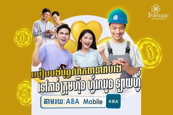 តស់ ទស្សនាវីដេអូខ្លីពីរបៀបបង់បុព្វលាភធានារ៉ាប់រង និងរបៀបកំណត់កាលវិភាគបង់បុព្វលាភធានារ៉ាប់រងបន្ត ទៅកាន់ក្រុមហ៊ុន ហ្វ័រឈូន ឡាយហ្វ៍ តាមរយៈ ABA Mobile។