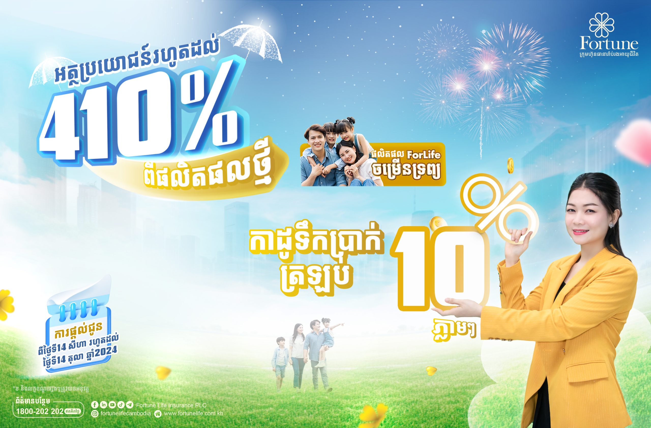 To celebrate the launch of our new product ForLife ចម្រើនទ្រព្យ, we are excited to announce special campaign of Instant 10% Cashback Discount to our new customers who purchase ForLife ចម្រើនទ្រព្យ from 14th August till 14th October 2024.